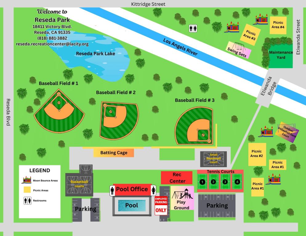 General Information: Reseda Recreation Center is located on Victory Blvd and Reseda. Our special features include: Multipurpose Center, Picnic Area, Playground, Four Tennis Courts, Outdoor Basketball Courts (two full courts and one half court), Field Space and Three Baseball Diamonds. The recreation building will be open during facility hours only, and will be locked at all other times. Groups may not exceed 100 people. Our staff, instructors, and volunteers offer a variety of programs and activities for the community. Day camp programs, sports leagues/programs, dance, and fitness activities are all available.