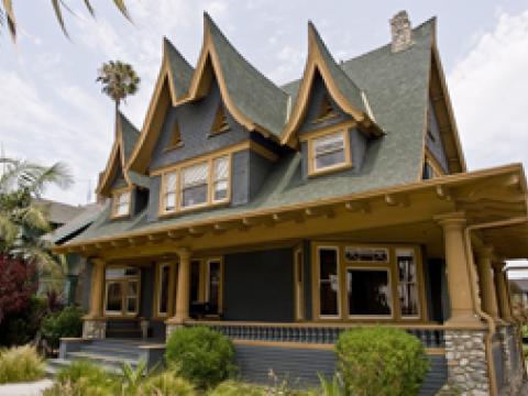 The South Seas House has stood in the Historic West Adams District for more than 100 years. Originally Built in 1902 by Los Angeles music patron Joseph DuPuy, the two-story house is a combination of several styles-- Victorian, Queen Anne, Colonial Revival and Craftsman, to name a few. The house has intrigued generations with its sharply peaked Polynesian-style gables (unlike any other constructed in that era), arroyo stone pillars, clapboard outer walls and triangular attic vents. Experts say it was one of Los Angeles' first tropical-themed houses, the precursor to the exotically eclectic architecture of the 1920s.