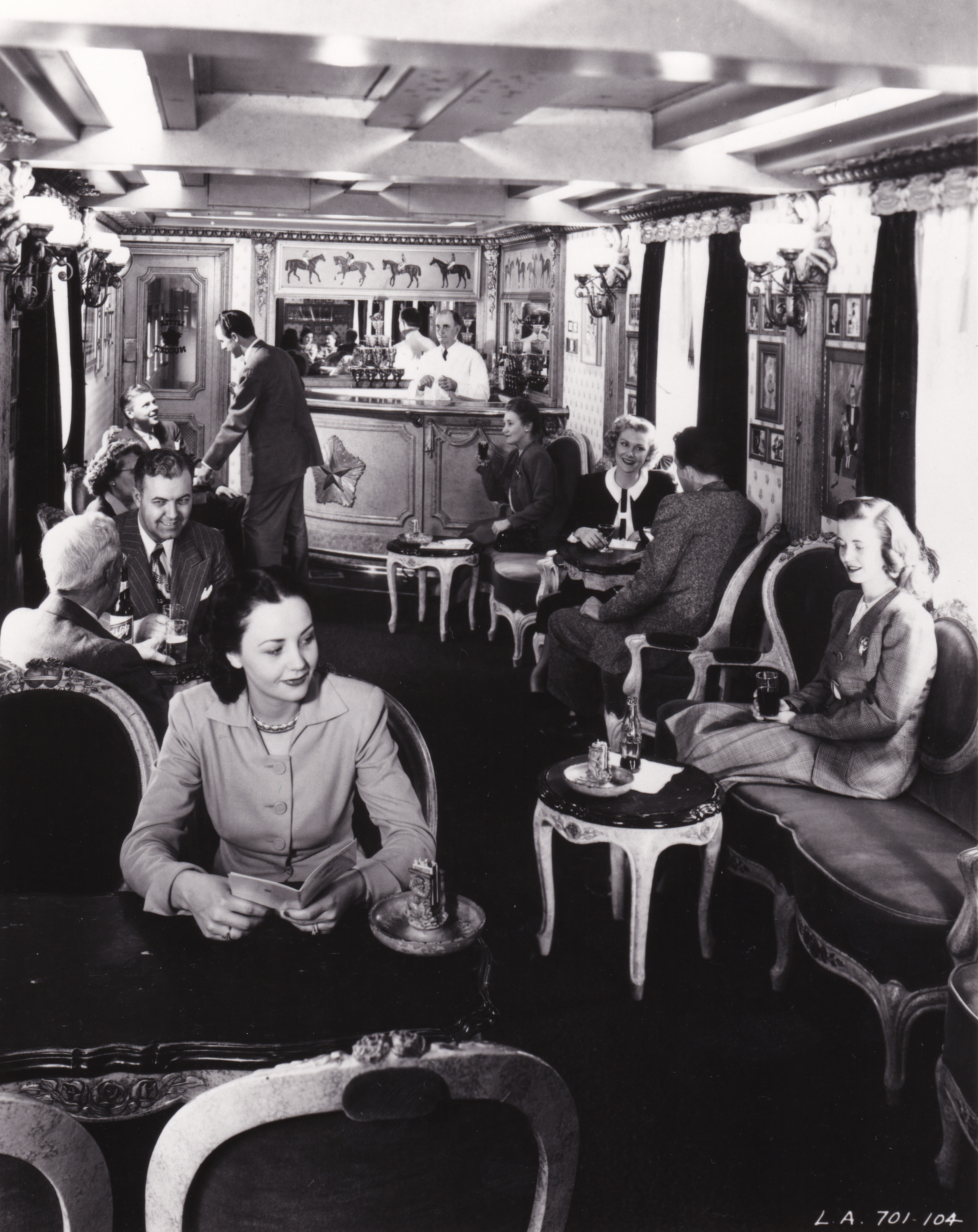 This club car was designed for the Union Pacific by the American artist, Walt Kuhn. Kuhn had previously designed a pair of specialty club cars for U.P.'s City of Denver train both named "The Frontier Shack." They featured rough-hewn wood rafters and interior panelling, animal skins and antlers on the walls, and hanging oil lamps. For the Streamliner City of Los Angeles, a Union Pacific train carrying passengers between Chicago and Los Angeles, Kuhn improved on his own gaudy and extravagant imagination. The result was "The Little Nugget" car, a Victorian dream of red velvet sofas and drapes, bevel-edged mirrors, gas lamp-style, stars twinkling on the ceiling and caricatures of famous vaudevillians crowding the walls. Bartenders and waiters wore gay nineties attire. "The Little Nugget" was the show-stopper of the City of Los Angeles, despite its other classy observation cars, lounges, and diners.