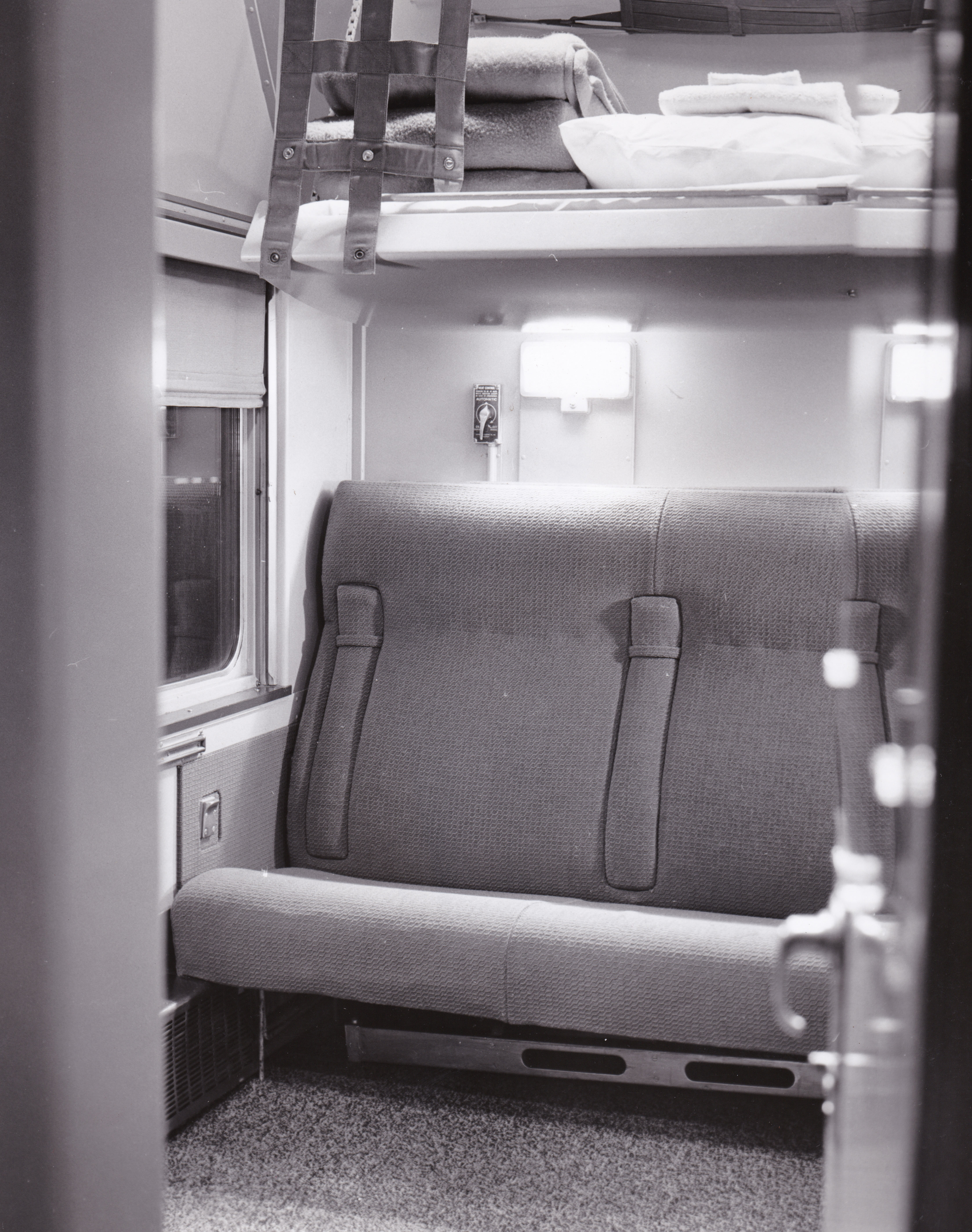 Sleeping cars on passenger trains existed before 1850. Like the sleeping cars of the “modern” age they featured seating for the day and mechanical transformation to a bunk for night. Not until after 1850, when train trips more often exceeded a day, did sleeping cars become common. Open-section sleeping cars appeared as a chair car by day, with the bedding hidden in berths above the passengers’ heads. Little nighttime privacy was available in the open configuration. Passenger pressure to have the luxury of private compartments or roomettes forced the primary sleeping car provider, Pullman Company, to invest in designing and building more cars with private rooms. The “Hunter’s Point” with its combination of different room sizes for different size travelling parties was a common layout. Compartments offered seating for day, private commodes and sinks, and were similar in features to hotel rooms for those driving from city to city.