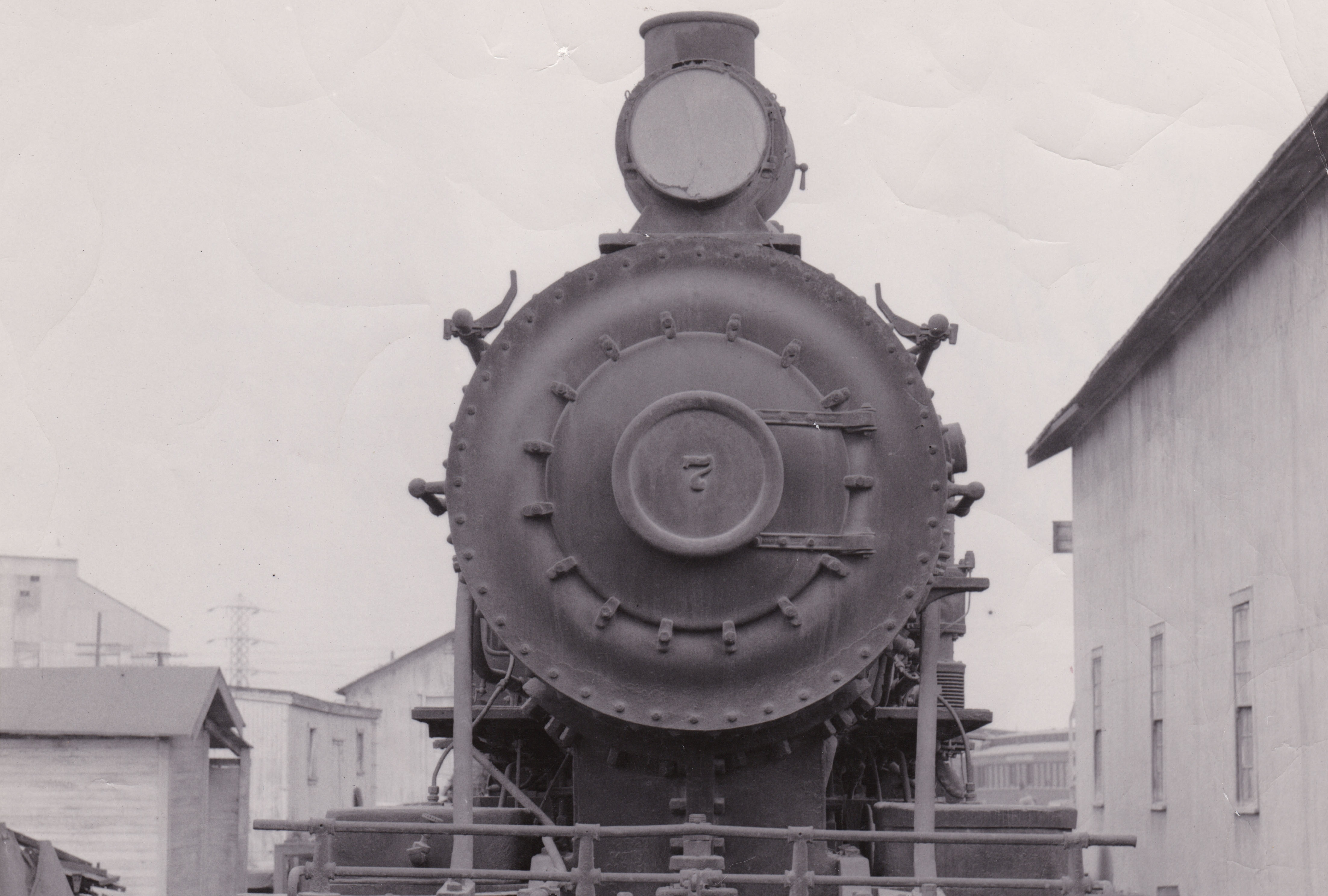 Each of these formerly independent companies became a production tentacle of the American Locomotive Company (ALCO) octopus. Baldwin and ALCO remained in head-to-head competition for nearly 50 years eventually, building diesel locomotives as well in the 1930s and 1940s. Both companies ¾ in this transition ¾ failed, leaving that field to General Electric and Electro-Motive Division of General Motors. In 1956, Baldwin ceased production; ALCO disappeared abruptly in 1969. This engine, the Sharp and Fellows #7, was originally built about 1902 with a 2-6-0 wheel arrangement for the Minnesota Land and Construction Company. In 1909, it was sold to C. H. Sharp Construction Company, who added a two-wheel trailing truck under the engine cab and then used the locomotive in the building of the Santa Fe Railway System through Kansas, Texas, Oklahoma, New Mexico, Arizona, and California. During the First World War, #7 served at Camp Kearney, San Diego, and served during World War II at an assortment of ordnance depots, including Defense Ordnance at Fort Wingate, New Mexico and the Navajo Ordnance Plant at Flagstaff, Arizona.